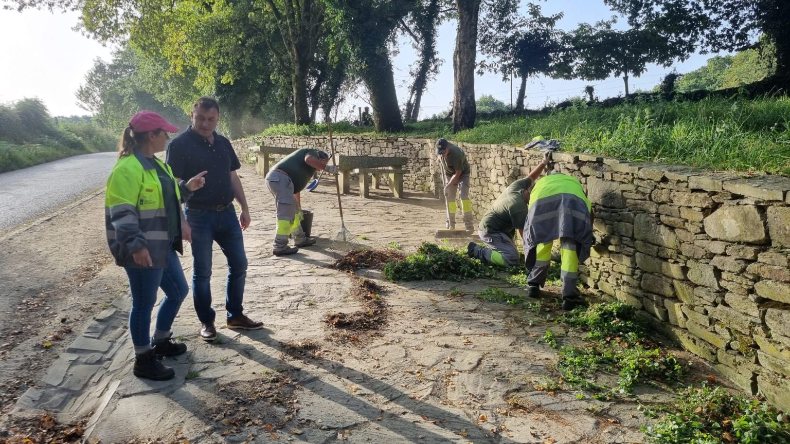 Xoves, 10 de agosto de 2023.- O alcalde de Monterroso, Eloy Pérez, achegouse ata algúns dos lugares onde realizan o seu traballo os alumnos do obradoiro dual de emprego do módulo de xardinería. En concreto, o rexedor estivo no albergue de Ligonde e no cruceiro dos Lameiros, ao seu paso polo Camiño Francés, onde os 8 alumnos e alumnas deste módulo realizan labores de limpeza e acondicionamento do itinerario Xacobeo.