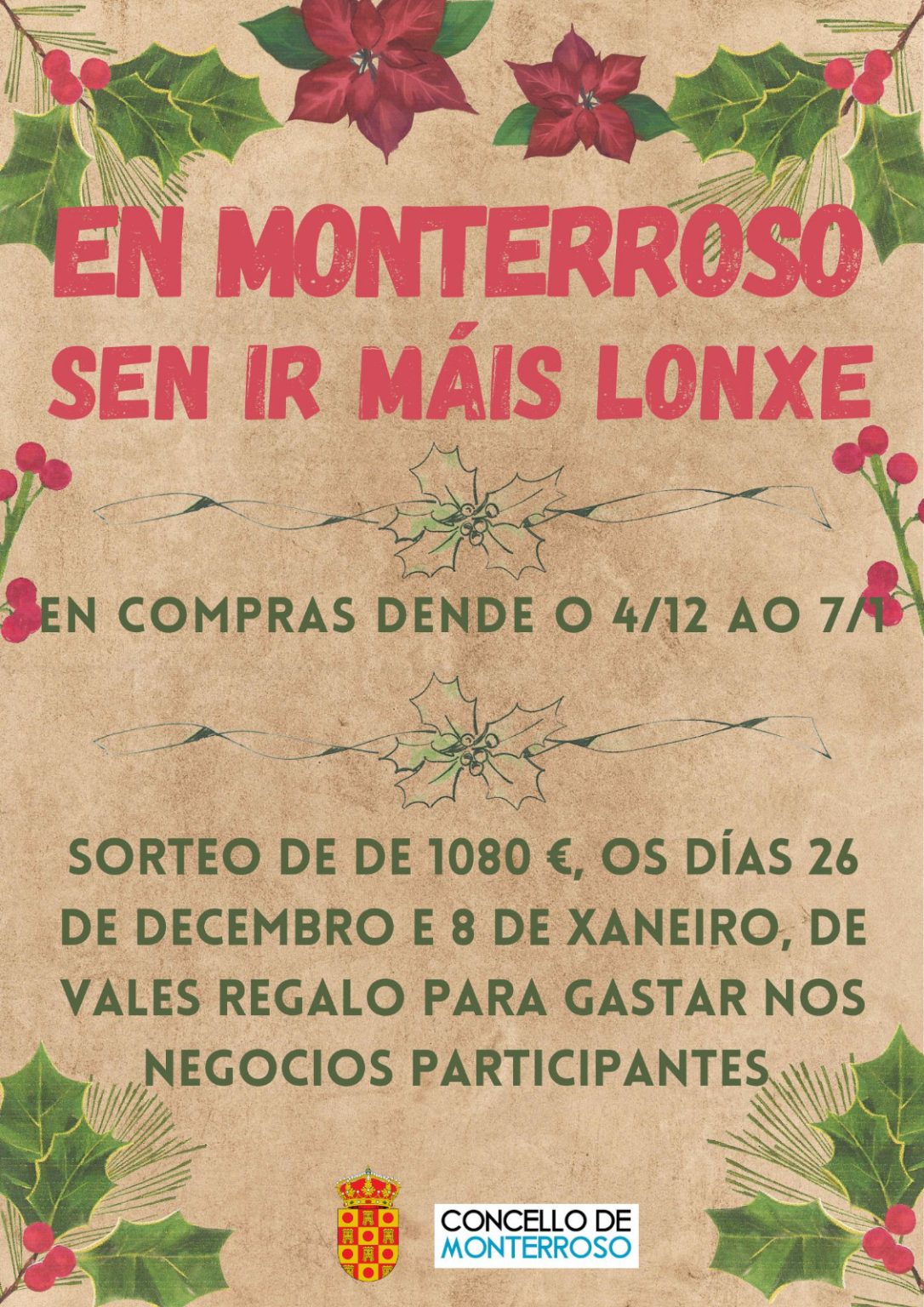 O Concello de Monterroso, en colaboración cun grupo de empresarios da vila, convoca e participa na organización do evento Campaña de Nadal ‘Comercio na rúa’, entre os días 4 de decembro e 8 de xaneiro, co obxectivo de incentivar e potenciar o consumo na vila.