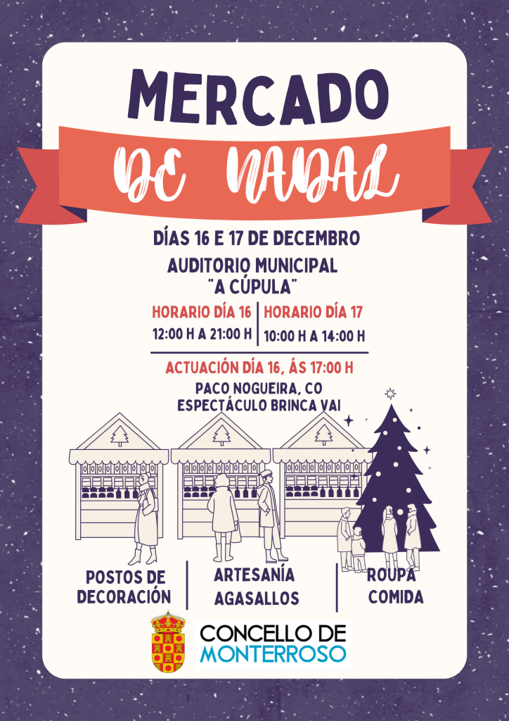 O Concello de Monterroso vai celebrar un Mercado de Nadal os días 16 e 17 de decembro no Auditorio Municipal A Cúpula.Participan:Modas Triscos,Mercería Casa Gaseosas,Creaciones Gaspar,Marton Sport,Mimacuir,Xurso (Artesanía en madeira),Labores Carmen,Cruz Gayoso (alimentación),IES Monterroso eCEIP MonterrosoO sábado ás 17:00 horas actuación de Paco Nogueira co espectáculo ‘Brinca Vai’.O Concello de Monterroso convida a participar no mercado […]