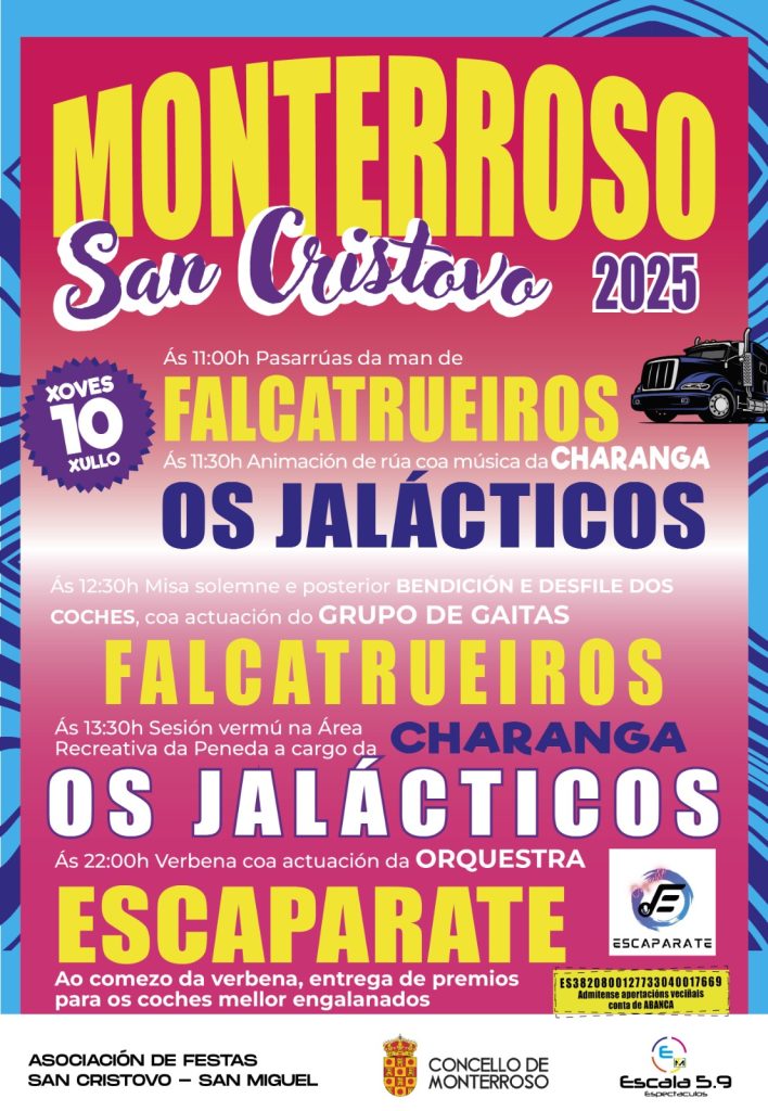 O Concello de Monterroso celebra o vindeiro xoves 10 de xullo as Festas de San Cristovo 2025.A celebración inclúe pasarrúas, misa, bendición e desfile dos coches -con premios para os mellor engalanados- sesión vermú e verbena.O Goberno local informa que os veciños e veciñas que queiran festexar o xantar popular na Área Recreativa da Peneda o vindeiro 10 […]