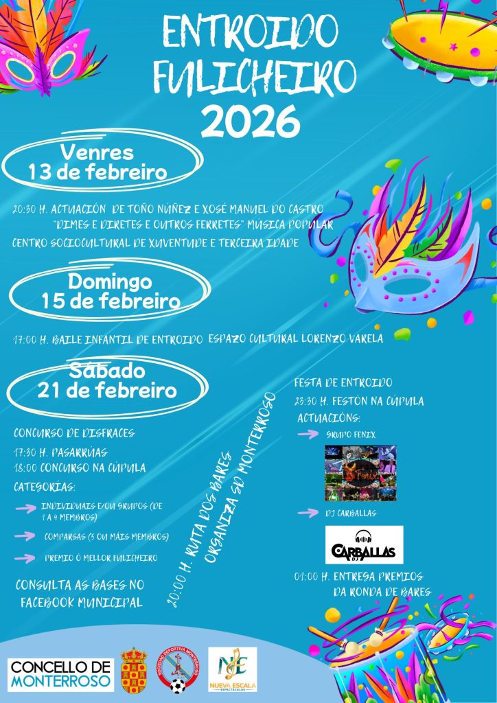 O Concello de Monterroso prepara unha ampla programación para celebrar o Entroido deste ano 2026 con tres días de actividades. O venres día 13 de febreiro, Concerto de música tradicional con Toño Núñez e Xosé Manuel do Castro. ‘Dimes e diretes e outros ferretes’, música popular ás 20:30 horas no Centro Sociocultural de Xuventude e […]